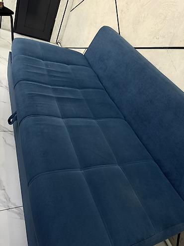Компактный прямой диван-кровать в современном стиле, обитый мягкой бархатистой тканью насыщенного синего цвета. Стеганая поверхность с крупной квадратной прострочкой придает аккуратный вид и обеспе...