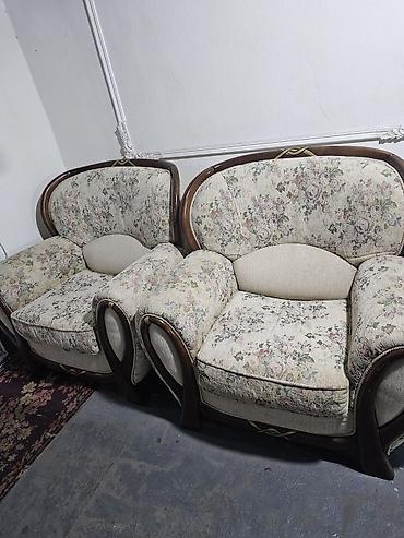 Диван сатылат эки креслосу менен, диван +2 кресла=8 000 сом. состояние отличное, выцвела местами ткань.