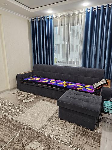 - Размеры (ориентировочные по фото): длина дивана около 2,4–2,7 м; высота спинки выше средней; пуф квадратной формы примерно 60–70 см по стороне и ~45 см по высоте.