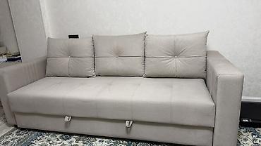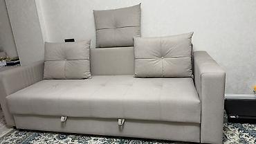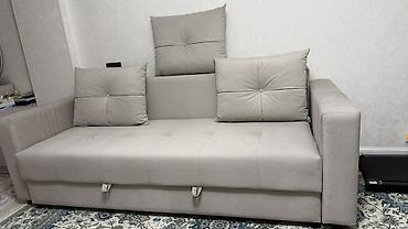 Диван-кровать с механизмом раскладывания “книжка”. - Размеры ориентировочно: спальное место близко к двуспальному (по фото — ширина около 120–140 см, длина около 190 см). - Три крупных подушки в к...