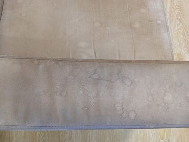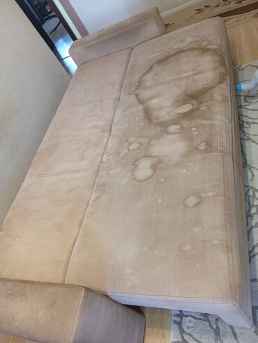 - На фото видно: следы от влаги/пятна по плоскости сиденья и спального места, потёртости на торцах подлокотников, локальные зацепы ткани.