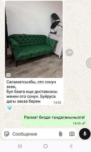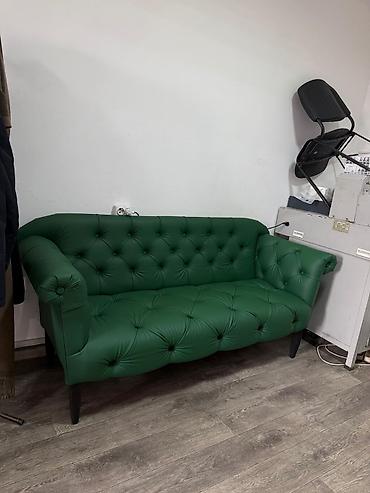 Зелёный диван и кресло в классическом стиле Честерфилд. Особенности: - Обивка: экокожа глубокого изумрудного оттенка - Каретная стяжка с декоративными пуговицами по спинке, сиденью и подлокотникам...