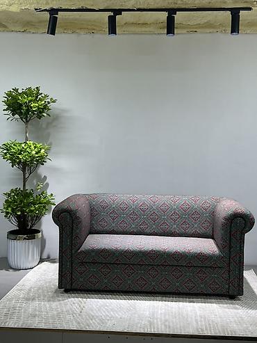 Диван двухместный в классическом стиле «честерфилд» с высокими подлокотниками и скругленными валиками. Обивка — ткань с геометрическим орнаментом (серо-зелёная гамма с красными акцентами), визуально устойчивая к загрязнениям и истиранию. Компактная глубина и прямая посадка — удобно для гостиной, кабинета или зоны ожидания.