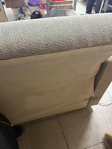 - Обивка: плотная мебельная ткань серо-бежевого оттенка с фактурным плетением.