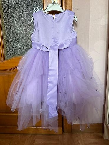 Нарядное детское платье сиреневого цвета с украшением в виде бабочек. На рост 100 см, Платье имеет пышную юбку с несколькими слоями ткани. Верхняя часть платья выполнена из гладкой ткани с небольши...