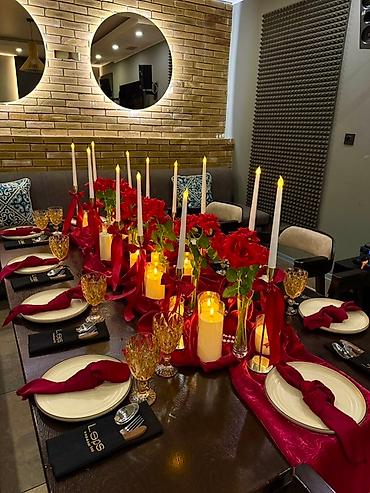 - Романтика в красных тонах — бордовые драпировки, розы, высокий ряд свечей.