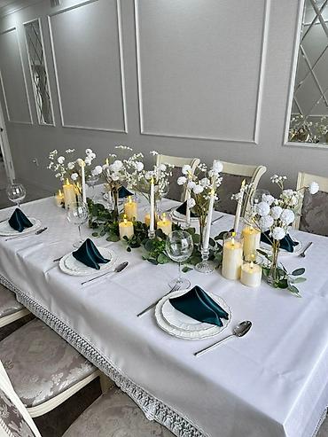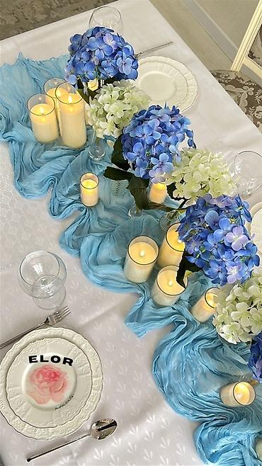 - Текстильные дорожки и драпировки разных оттенков (черный, бордовый, кремовый, небесно‑голубой и др.) для центральной линии стола.