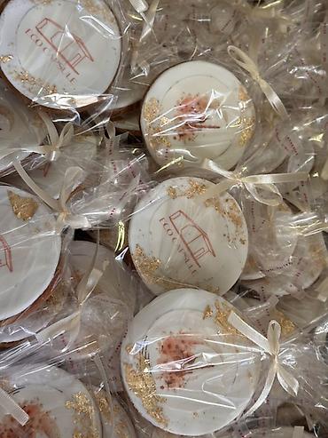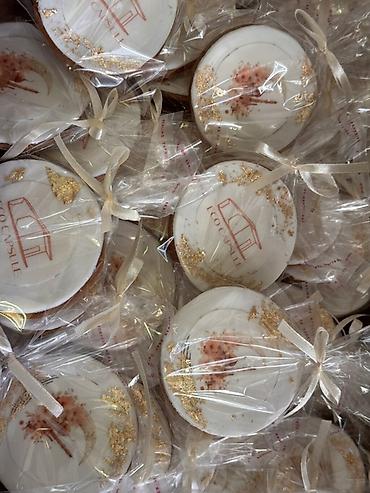 - Именные имбирные пряники/печенье. Круглая форма, белая глазурь, тонкая печать (в т.ч. логотипы, тематические рисунки) и золотая поталь. Каждое изделие — в индивидуальном целлофановом пакетике с бежевой лентой.