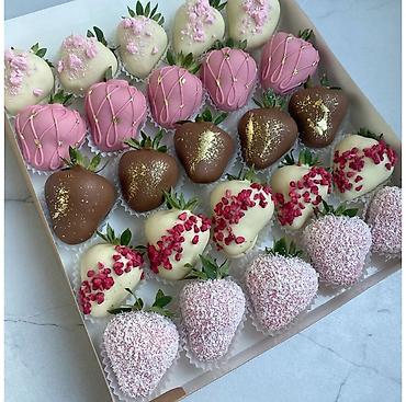 Подарочные наборы десертов в коробках. - Клубника в бельгийском шоколаде: микс покрытий (молочный, тёмный, белый), декор полосами, посыпками, дроблёными орехами, ягодами и лиофилизированной малино...