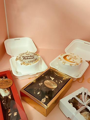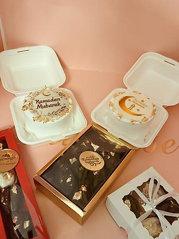 Подходит для поздравлений, корпоративных наборов и подарков на Ифтар/Сухур. Возможна тематическая печать на поверхности (надписи, логотип, полумесяц, мечеть и др.). Сочетаются в наборах: мини‑торт + шоколад + пряники. Элегантная презентация и готовая подарочная упаковка.