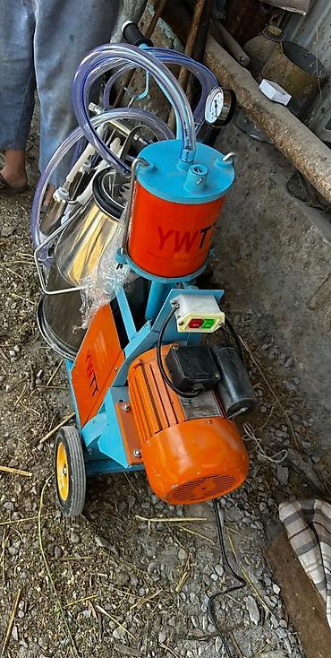 Предназначенный для эффективного доения, этот мобильный доильный аппарат оснащен прочным металлическим каркасом, окрашенным в синий цвет, и вместительным бидоном из нержавеющей стали. Оранжевый кожух двигателя и резервуар сверху придают аппарату яркий и заметный вид. Четыре доильных стакана обеспечивают одновременное доение, а прозрачные шланги позволяют контролировать процесс. Наличие колес упрощает перемещение аппарата по ферме или между животными, делая его удобным решением для молочных хозяйств.