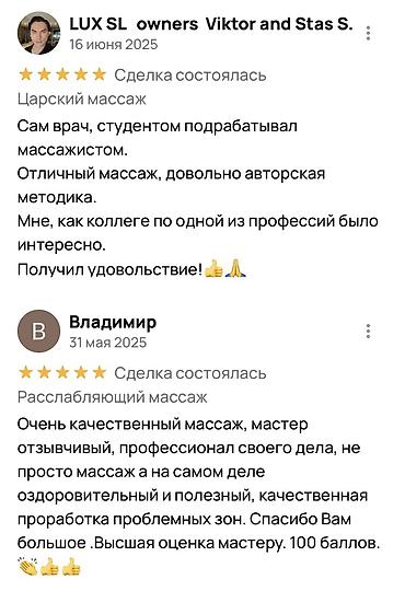 Я работаю не только с телом, но с энергией. На моём сеансе каждый может ощутить расслабленность и покой. У меня сильные и чувствительные руки. В основе моей работы - глубокое понимание физиологии человека. У меня полностью индивидуальный подход к каждому.