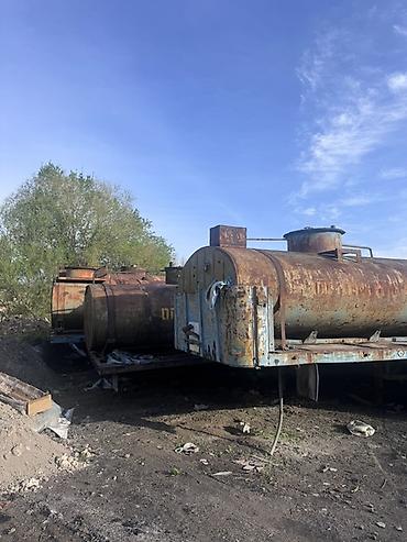 Прицеп-цистерна/бочка на колесном шасси - Объем ориентировочно 3–5 м³ (визуально крупногабаритная горизонтальная бочка на раме). - Конструкция: стальная цилиндрическая емкость на одноосном прицепе...