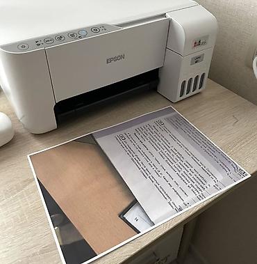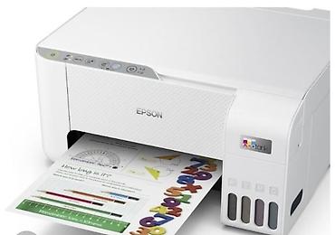 - Epson EcoTank L3256/L3266 (белый корпус, серия L32xx) – многофункциональное устройство с встроенными емкостями для чернил и кнопочной панелью: питание, Wi‑Fi, копирование/сканирование. Печать документов и цветных материалов, копирование и сканирование через верхний планшет. На фото показан вывод отпечатков и окошки резервуаров BK, C, M, Y для контроля чернил.