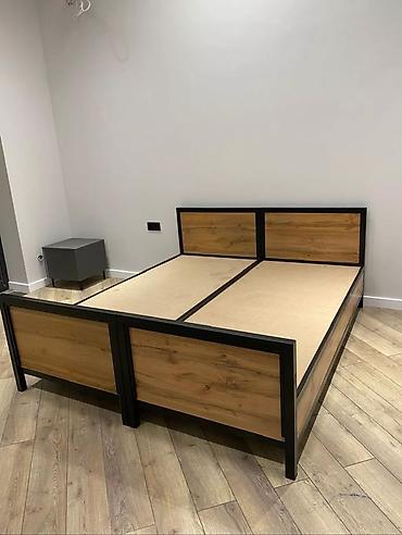 Прочная и стильная кровать с металлическим каркасом и вставками из ЛДСП под дерево.