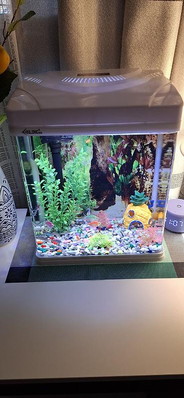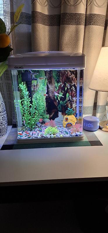 Готовый аквариум с рыбами Комплект “под ключ” — всё как на фото, запущен и обжит: - Прямоугольный аквариум настольного формата (примерно 25–35 л), крышка с встроенной LED-подсветкой. - Фильтр внут...