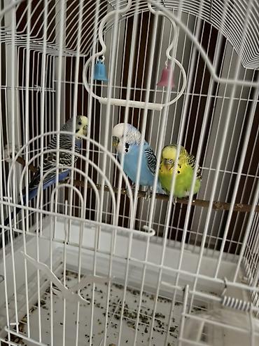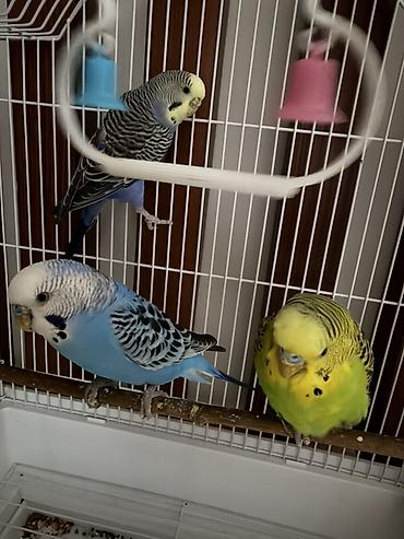 - 3 волнистых попугая разных окрасов: голубой с белой шапочкой, зелёно‑жёлтый, синий с тёмными волнами.