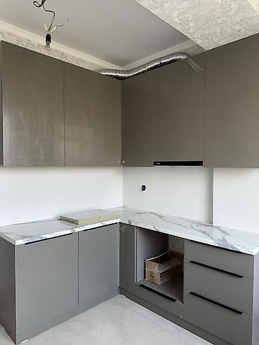 - Кухня с новым гарнитуром, столешница под мрамор, керамогранит на полу.