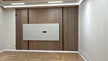 - Внутри: залы с декоративными потолками и линейной подсветкой, крупноформатный керамогранит, паркет ёлочкой, стены под ТВ-панель и встроенные системы хранения