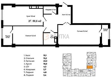 2 комнаты, 87 м², Элитка, 6 этаж, Готовая ПСО (под самоотделку)