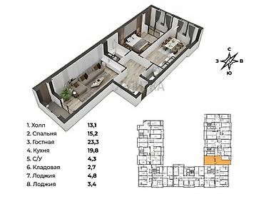 2 комнаты, 87 м², Элитка, 6 этаж, Готовая ПСО (под самоотделку)