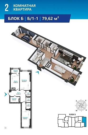 2 комнаты, 80 м², Элитка, 7 этаж, Готовая ПСО (под самоотделку)