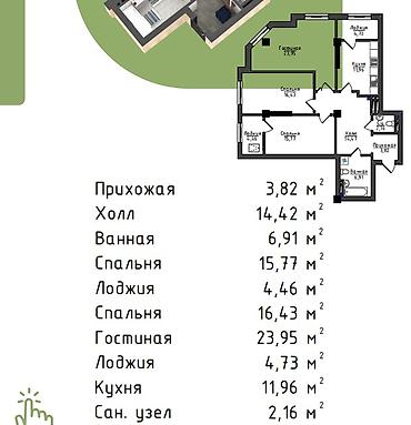 3 комнаты, 105 м², Элитка, 13 этаж, Готовая ПСО (под самоотделку)