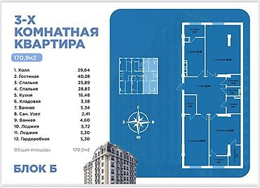 3 комнаты, 171 м², Элитка, 9 этаж, Готовая ПСО (под самоотделку)
