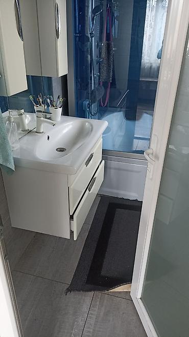 - Санузел с душевой кабиной, умывальником и тумбой с выдвижными ящиками; смеситель, зеркало‑шкаф и аксессуары для хранения.