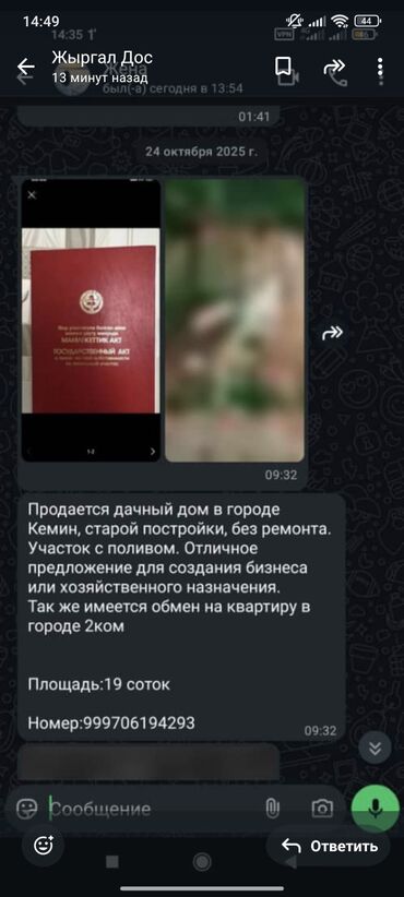 Продаётся дом в г.Орловка Кеминский район, участок 6 соток на красной книге 4 комн. санузел, топка, отопление твёрдое топливо, электрическое. отдельно летняя кухня, молодые плодовые деревья яблони,...