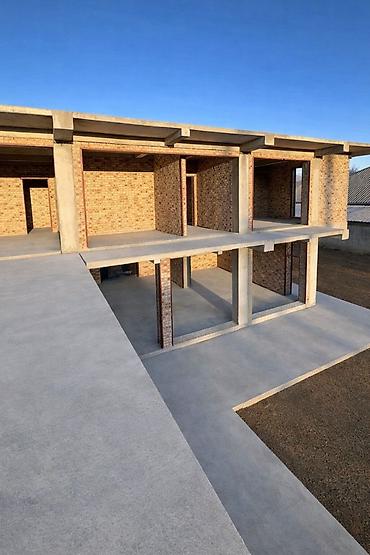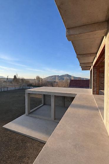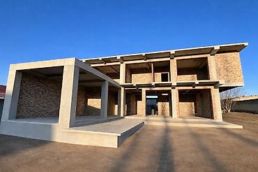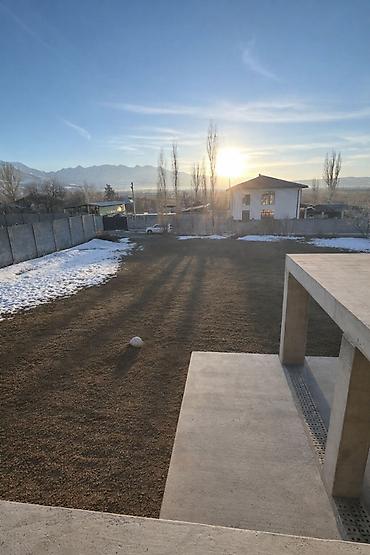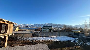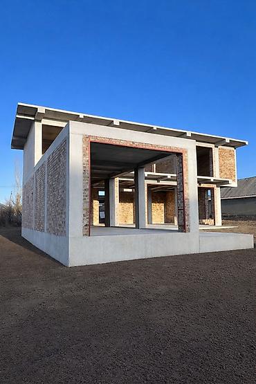 Полностью монолитный дом, заполненный кирпичом, С панорамными окнами и с видом на горы Ала-Арчинского массива.