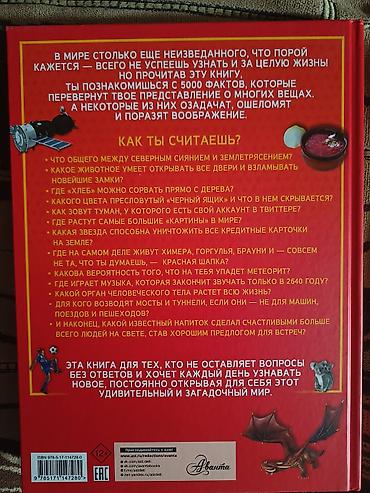 ПРОДАЕТСЯ ЭНЦИКЛОПЕДИЯ 5000 УДИВИТЕЛЬНЫХ ФАКТОВ, КОТОРЫЕ МОЖНО ИЗУЧАТЬ ЦЕЛЫЙ ГОД. Если хочешь открыть для себя весь мир, начни с 5000 фактов! Многие из них станут для тебя настоящим сюрпризом, озадачат, ошеломят и поразят воображение. Из этой книги ты почерпнешь всесторонние знания о многочисленных предметах и явлениях: о животных и растениях, радуге и тумане, городах и мостах, богах и фантастических существах, науке и технике и о многом многом другом — даже о Гарри Поттере! Эта разносторонняя информация пополнит твой запас знаний и расширит кругозор, придав знакомым вещам новые черты и расставив неожиданные акценты в казалось бы привычных вопросах. Издание будет интересно каждому, в ком жив дух исследователя и кто не устает удивляться настоящим чудесам, созданным руками человека или самой природой. Для среднего и старшего школьного возраста. Серия книг