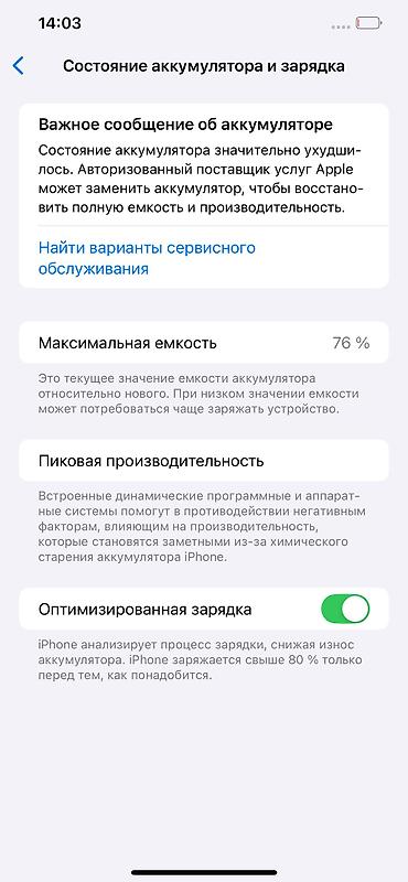 IPhone с OLED‑дисплеем , Face ID и вырезом Dynamic Island. На экране видно: раздел “Состояние аккумулятора и зарядка” с максимальной ёмкостью 80% и включённой функцией “Оптимизированная зарядка”. П...