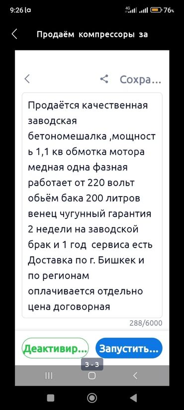 Средняя (150 - 300 л)Продается новая , качественная , бетономешалка на 200 литров мощность 1,1кв. Есть доставка платная по городу Бишкек