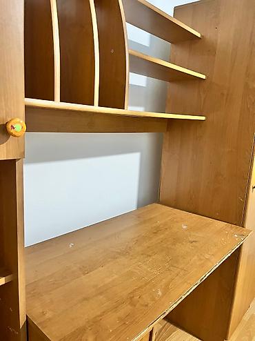 Учебная парта - Материал: ЛДСП светлого оттенка с текстурой древесины. - Размеры ориентировочно: ширина около 80–90 см, высота около 80–85 см. Замок от дверцы не работает,нужно будет починить.