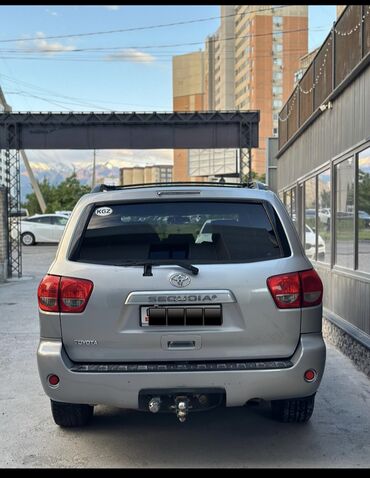 Toyota Sequoia, полноразмерный 7‑местный SUV. Основное: - Бензиновый двигатель i-Force V8 (шильдик на кузове), автоматическая коробка. - Полный привод. - Цвет кузова: серый. - Номерной знак KG (Ки...