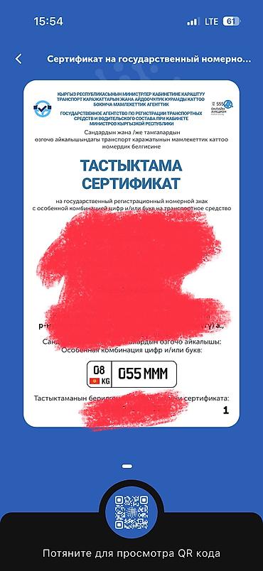 Продаётся сертификат на государственный регистрационный номер с особенной комбинацией цифр и/или букв для транспортного средства в Кыргызской Республике. Характеристики: - Регион: 01 (Бишкек), фор...