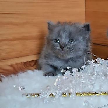 Шотландец, котёнок шиншиллового окраса (серебристый с тенями), короткошёрстный. Большие круглые голубые глаза, плотный костяк, плюшёвая шерсть с мягким подшёрстком. Компактный формат, короткие лапк...