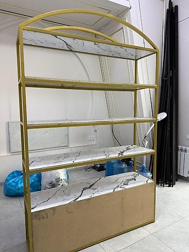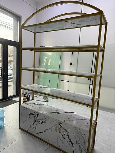 Торговое оборудование для магазина/островка Состав: - Напольные витрины-стеллажи с арочными рамами цвета золото. Каркас металлический, полки белые ламинированные. Стеллажи двухсторонние и пристенн...