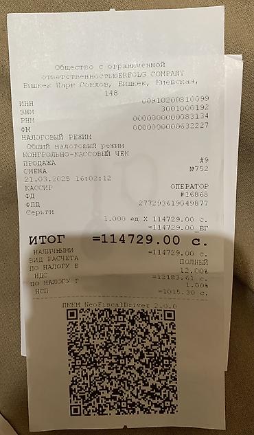 Купила себе несколько комплектов серёжек с бриллиантами, эти серьги абсолютно новые с биркой и защитными пломбами, продаю за 12000 сомов. К ним есть в комплект подвеска с одним бриллиантом и кольцо...