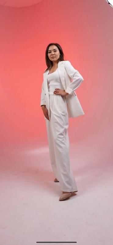 Белый женский костюм, состоящий из пиджака и брюк. Пиджак двубортный