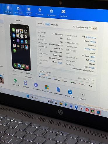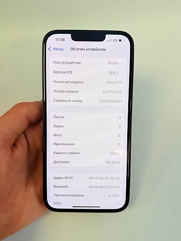 IPhone 13, 128 ГБ, цвет Midnight (чёрный/тёмно‑синий) Идеальное ничего не менялось Акб 86% Цена 29,000 тысяч сом