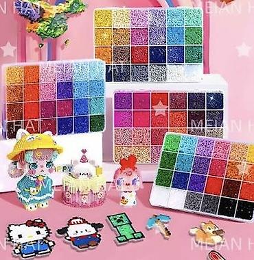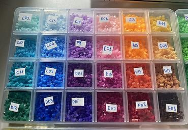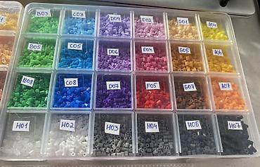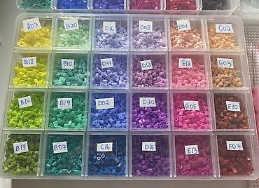 72 цвета, каждый уже пронумерован своим цветовым кодом на крышке. Также инструменты и доска для выкладки бусин + лист готовых трафаретов (можно брать и из интернета); еще в комплекте идут три листа с кодами этих цветов и небольшой кусок пергамента