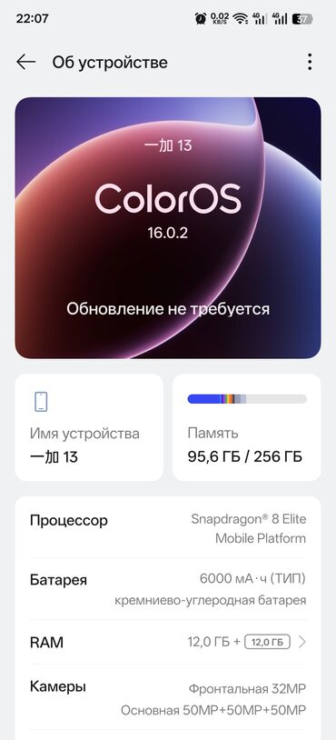 OnePlus 11 5G — мощный флагман на OxygenOS 16.0.1. Характеристики: - Процессор: Snapdragon 8 Gen 2 Mobile Platform - Память: 256 ГБ встроенной, доступно ~56,2 ГБ - ОЗУ: 16 ГБ (+ расширение до 12 Г...