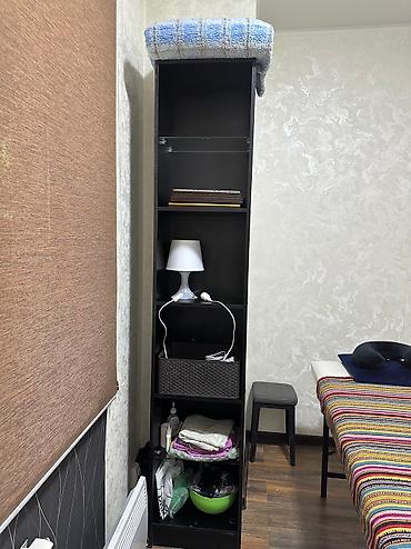 Белая напольная мебель для салона/дома: 1) Шкаф с открытой нишей и закрытой тумбой снизу. - Габариты: высота 2 метра, ширина 70 см (указано на фото). - Верх: открытая полка для аксессуаров/декора,...
