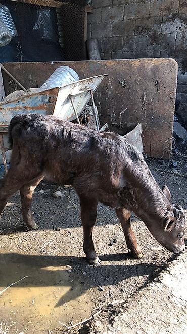 Телёнок мясного направления. - - Окрас: тёмно-каштановый с белой отметиной на морде - Возраст: примерно 7–10 месяцев (по габаритам на фото) - Идентификация: ушные бирки с номером - Особенности: кр...