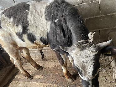 - Порода/масти: пёстрые и тёмно-бурые, рогатые, с бирками на ушах.