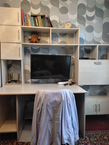 Продается детский гарнитур состояние хорошее, 2 кровати, письменный стол с полками, шкаф для одежды. Цена 8000с . Самовывоз