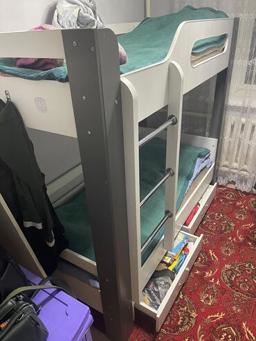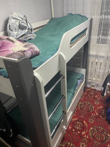 Продается детский двухъярусный кровать из чистого дерево с двумя комодом, размеры: длина 160, ширина 85, высота 160, прочный, красивый цена 9 000 сом, район Восток 5 тел.