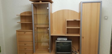 2 вместительный шкафа (глухой и с обтекаемой стеклянной дверцей) , комод с выдвижными ящиками и полками, тумба под телевизор. Есть подсветка...